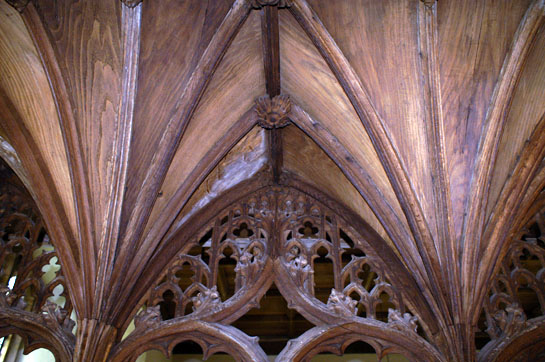 The rood screen completely dominates the church. In the centre is a recess that would have housed the rood (cross) itself. Note to the left of the screen, partly obscured by the pulpit, an Easter Sepulchre. See the footnote below for more about this.