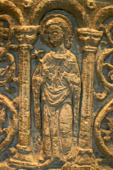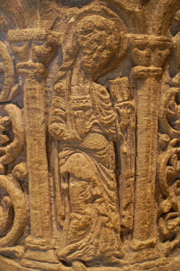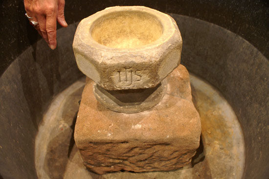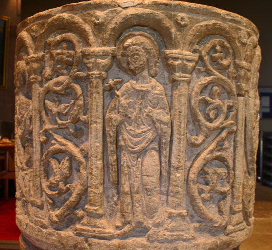 Left: We were shown this smaller stoup within the main font and were told what it was - I regret to say that I have forgotten! Right: The doorways have particularly fine and sophisticated label stops. The west door shown here has angels at both ends.