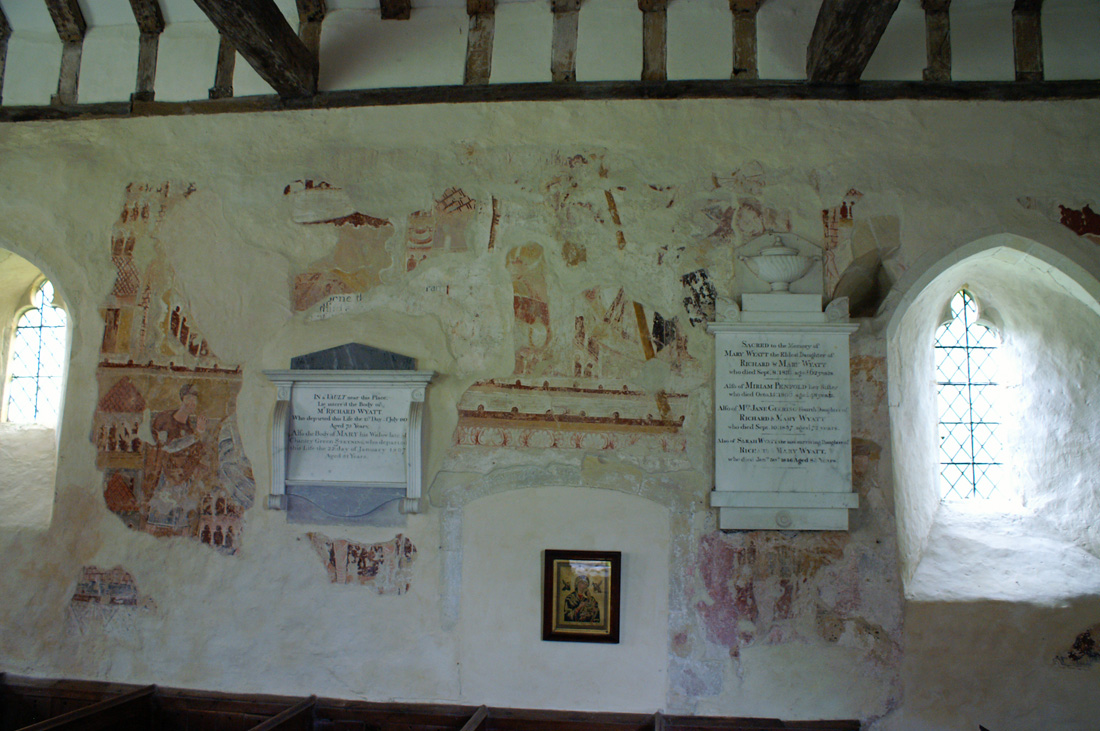 Looking to the west end. The wall and window are comparatively “modern” and so, of course, are the paintings that can be seen either side of the window. Note, however, that the mediaeval painting continues on both north and south walls.