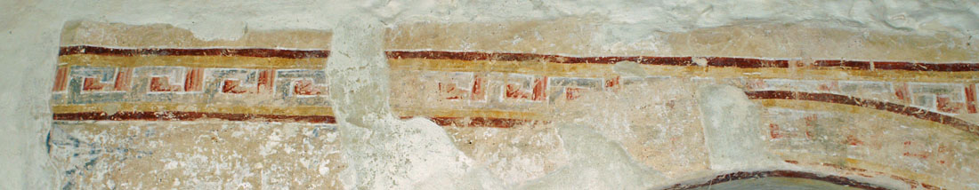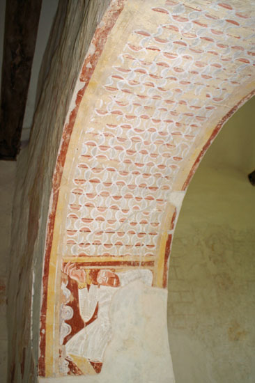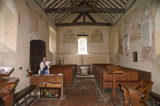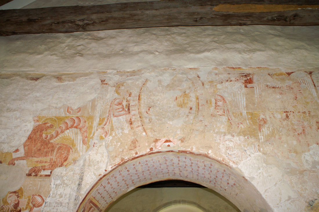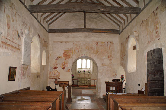 Looking to the east end of the church. Considerable fragments of wall painting can be seen both around the chancel arch and on both side walls. Note the simple undecorated chancel arch.