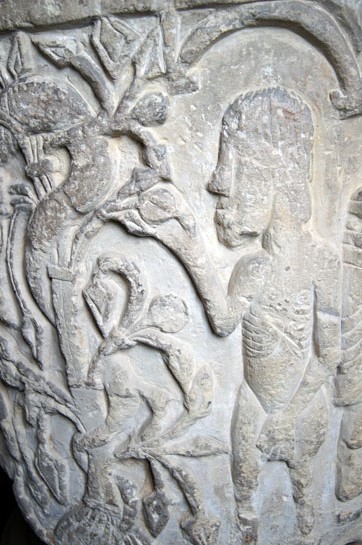 Left: St Mary - possibly. Centre: Part of the Adam and Eve scene. The sculptor had put considerable effort into this composition. Note particularly the splendid serpent with forbidden fruit in his mouth being proffered to Eve who is covering her genitals with her hand. Two little circles depict her breasts. The tree is stylised and actually quite inventive too. The carver, not to put too fine a point on it, was bedevilled by his lousy depictions of the human form! Right: Adam, his ribs clearly visible, is a stolid figure seemingly admiring the tree and, like Eve, using one had to preserve his modesty.