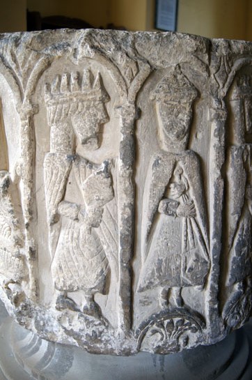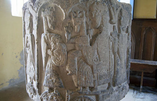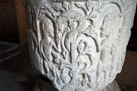 The elaborately decorated font itself, like lots of the Norman ones around here, has some unusual subject matter. There is a detailed study of the Temptation of Adam and Eve. There’s nothing unusual about that. But there are also Old Testament scenes of Jacob and Esau and of the Massacre of the Innocents and they are very unusual themes indeed. We also see the Magi and, possibly, St Mary to whom the church is dedicated.
