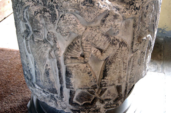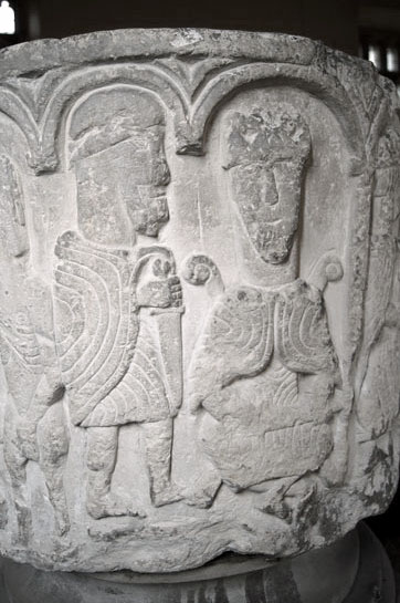 Left: The font. Right: On this panel Jacob and Esau are embracing after their reconciliation. They have the most extraordinarily shaped heads!