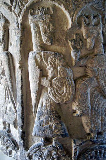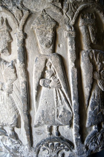 Left: King Herod on a saltire-shaped throne orders the Roman soldier (his gladius already drawn to avoid any doubt!) to his left to set about massacring the babies. Centre: Two of the Magi bearing their gifts. Note the bizarre way in which the head of the left-hand figure seems to have the head hanging from the neck. He wears a crown wille the central figure has a kind of conical hat. For the life of me, I can’t make out who is carrying gold, who is carrying myrrh and who is carrying frankincense, I’m sure Mary could have done without the myrrh! Right: Another of the be-crowned magi hands his gift to the baby Jesus.