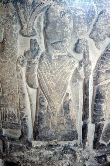Left: The representation of Jesus is a bit of a hoot really. He’s one big baby, already capable of sitting down and supporting his own head and sporting a natty line in crowns! One could be forgiven for thinking this was his fifth birthday party. Mary holds a lily in her hand behind Christ’s back. Centre; A close up of another of the Magi. Right: A bishop, crozier in one hand and his other hand raised in benediction.