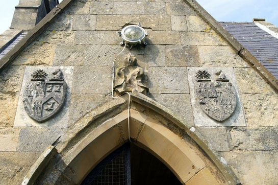 Left: The porch sports two sets of arms of the Sykes family. Right: The view to the west. One is struck by the tall proportions of the church. The font is almost hidden in this picture near the south door to the left.