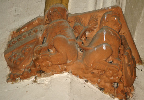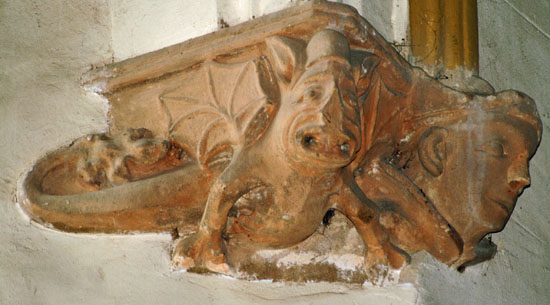A selection of corbels. Top left is an image of St Margaret of Antioch to whom this church is dedicated. Note that her cross is in the mouth of a beast. This refers to the legend that she refused the hand in marriage of a “heathen” official. He imprisoned her and the devil visited her in her prison in the guise of a dragon. Her cross choked the beast. Antioch being a Crusader city (in modern-day Turkey) perpetually under threat from the Mongols, Muslims and Mamelukes, this would have been an appealing allegory. Most extraordinary in my view, however, is the image bottom left which is an image of what appears to be a very passionate kiss indeed!