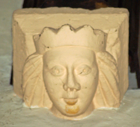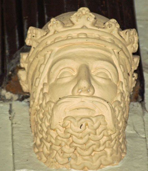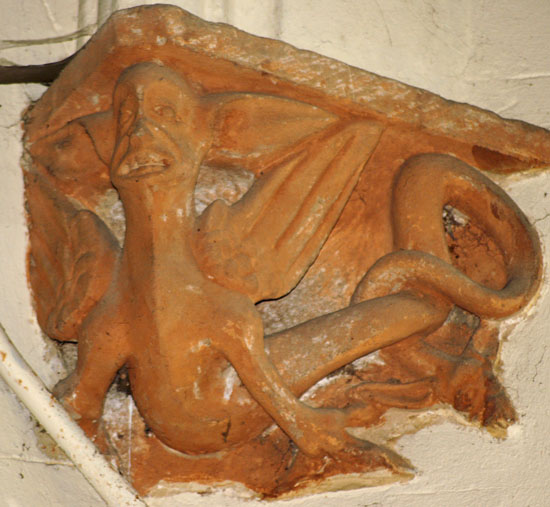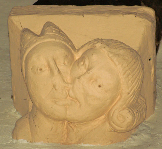 A selection of corbels. Top left is an image of St Margaret of Antioch to whom this church is dedicated. Note that her cross is in the mouth of a beast. This refers to the legend that she refused the hand in marriage of a “heathen” official. He imprisoned her and the devil visited her in her prison in the guise of a dragon. Her cross choked the beast. Antioch being a Crusader city (in modern-day Turkey) perpetually under threat from the Mongols, Muslims and Mamelukes, this would have been an appealing allegory. Most extraordinary in my view, however, is the image bottom left which is an image of what appears to be a very passionate kiss indeed!