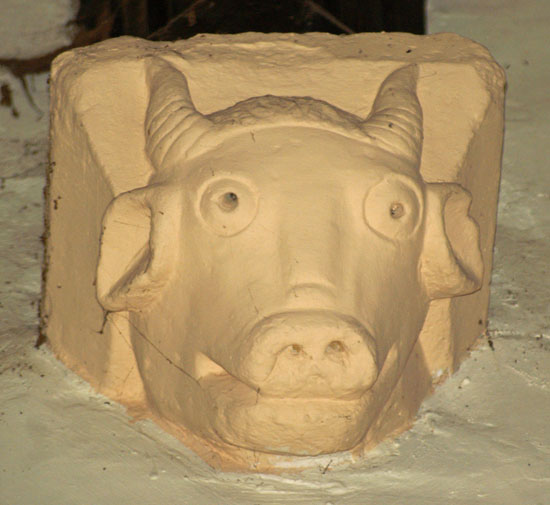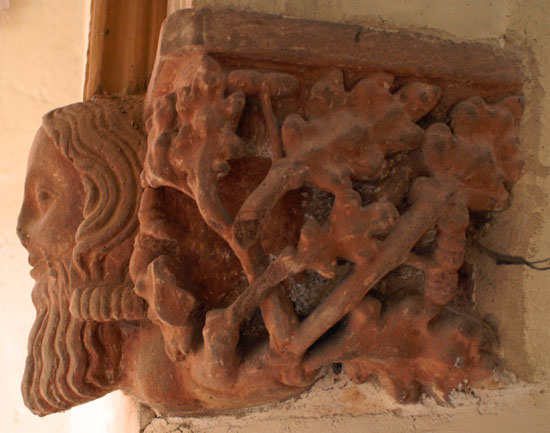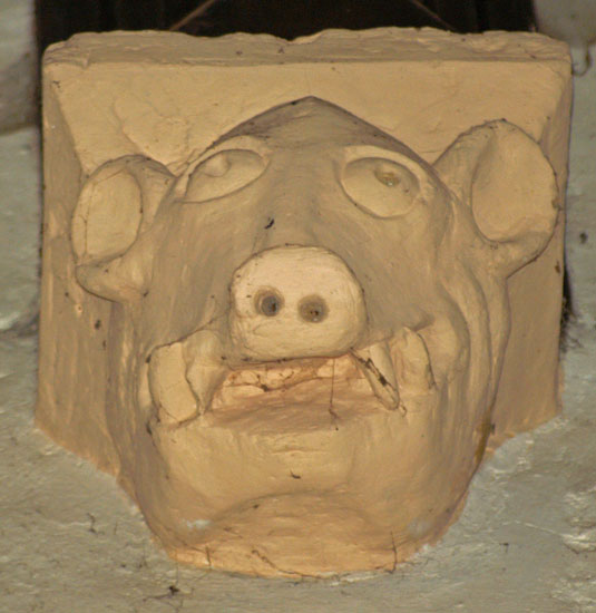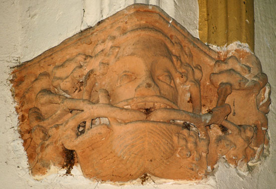 The font is not all that sets Crick apart, however. When the chancel was rebuilt during the Decorated period it was embellished internally with some very exuberant carvings at the ends of the window arches - window “stops” to be more technical . The nave roof corbels have further carvings. There is nothing restrained about these carvings: they are large and brash with a strong sense of mischief!