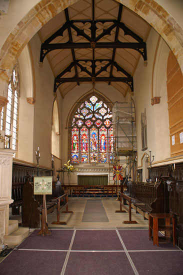 The chancel with its lovely Decorated east window. Note the window arch stops to the left and right of this picture.