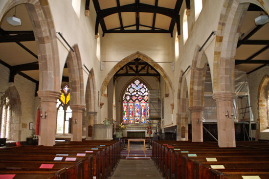 Left: With its whitewashed walls, clerestory and large aisle windows, Crick church is almost startlingly light - even on such a grey day as this. Right: The north aisle with its decorated east window.