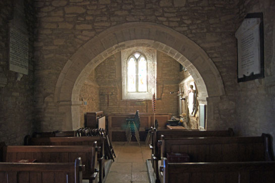 Left: The unadorned tower arch is definitely Norman and rather low pitched. Right: Inside the tower arch showing c13 early Decorated period window set within a deeply-splayed round-headed rebate.