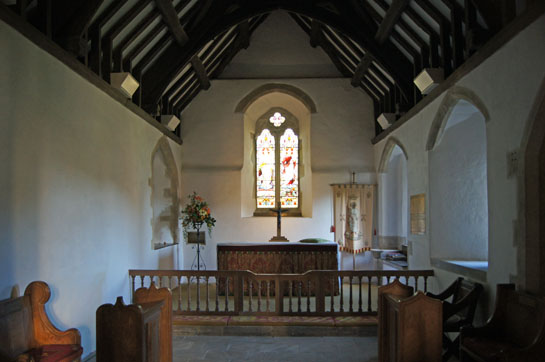 Left: Looking east with to the chancel and its “interesting” remodelled chancel arch. Right: The chancel is c13. The east window is an example of a very early type of early Decorated period window where the tracery has been formed by simply carving through the stone: that is to say, the tracery has not been carved as a separate piece. This is known as “plate tracery”.