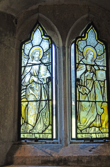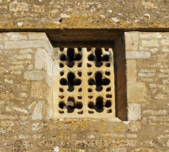 Left: The tower from the south west. Centre: The sides of the tower have these rather nice carved quatrefoil grilles. Right: An extremely unusual feature here is this very odd pair of opening stained glass windows in the north aisle!
