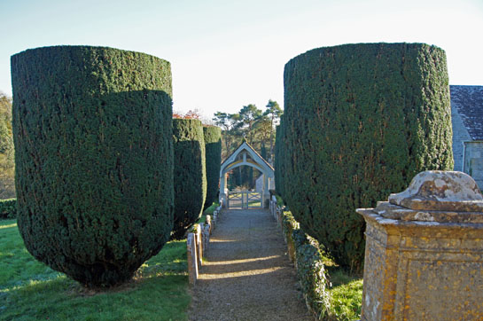 Left: The Transitional north arcade with the shallow north aisle beyond and the incongruous three bay chancel arch to the right. Right: The pathway to the south porch is lined by these six lovely yew trees.