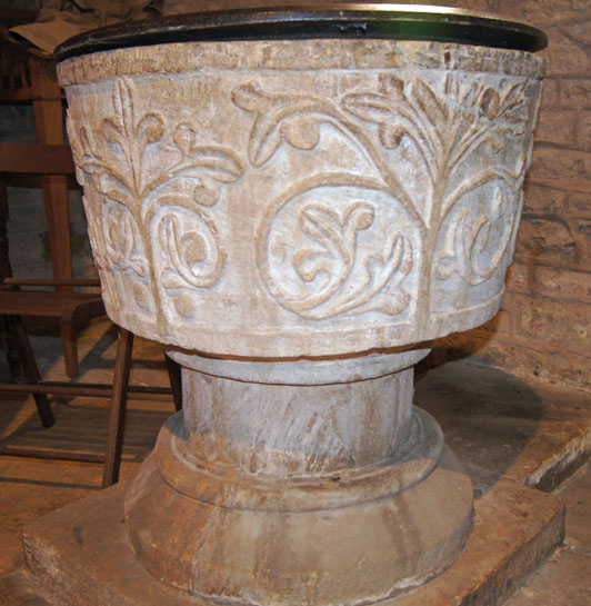 Two views of the font. The trilobed plant design is believed to represent the Holy Trinity. Note that it is circular, whereas the one at Duntisbourne Rouse is square with chamfered corners.
