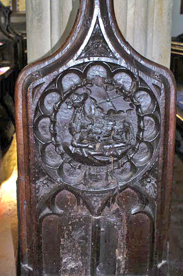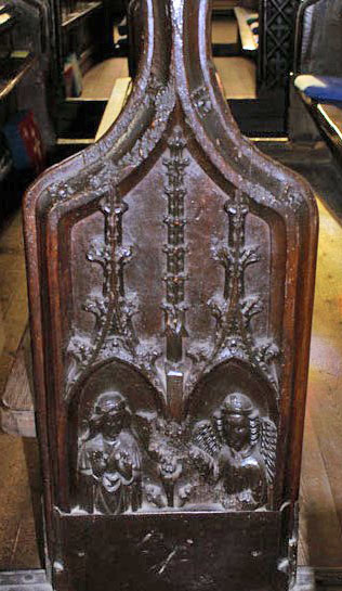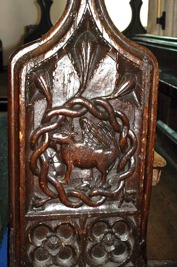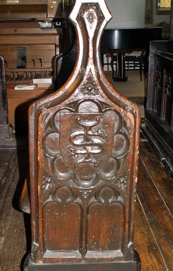 Left: The east end showing the delightful nave ceiling. Right: The ceiling closer to. Right: This bench end has the initials of John Selwood, Vicar from 1467-93. This was obviously a man of some capability. He built himself a manor house nearby that was demolished in 1708. He also refurbished Glastonbury Abbey and brought with him the pews that we see today. The Church Guide suggests, very plausibly, that they were brought here by flat bottomed boats through the maze of streams and rivers that used to (and to a lesser extent, still do) criss-cross this county.