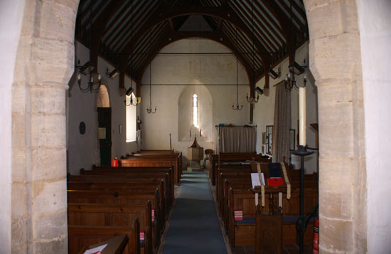 Left: The nave looking towards the chancel. Note the chancel arch that was originally round-headed Romanesque. The triple lancet east window is modern. Right: Looking towards the west wall. It was rebuilt in c19 so the lancet window and its deep splay are not really “authentic”. Behind the curtain to the right is the north door.