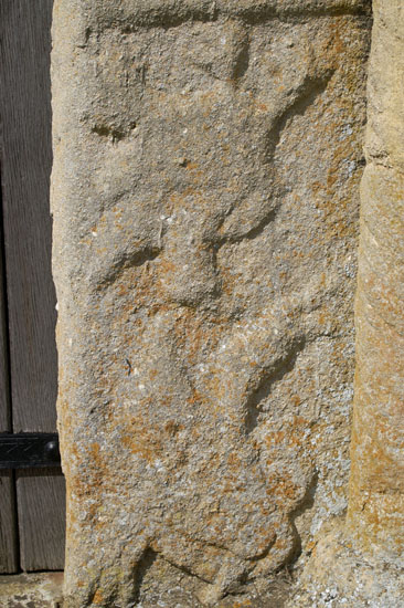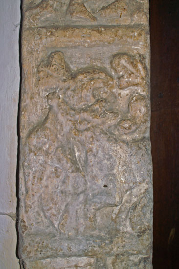 being a filled-in gap between the tympanum and the door arch and suggests that the tympanum is older and was brought from a church elsewhere or else that the whole doorway was recontructed at some point. Whatever the answer, the whole doorway seems to me to not quite fit together. Either side of the door, both inside and out, are slabs of stone with very weathered decoration. These sit between the decorated (but, again, badly weathered) pillars and the door itself. That is very unusual and to have decorations inside the door is even more so, although the likely explanation is that these were originally outside.