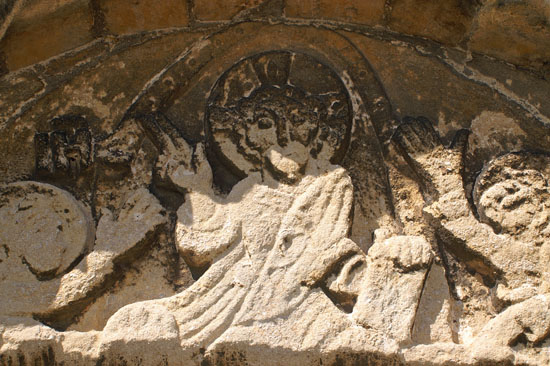 Left: The south door. The tympanum and the large decorated slabs are almost inserted into the Norman door way with its chevron decorated arch and door shafts. For all the world it looks like one doorway set inside another. Note the unusual upturn at each end of the hood mould. Right: The tympanum. Christ’s hight hand is raised in benediction. His left rests on the gospels - the same configuation as at Castor church. Just above the left angel can be seen the abbreviated monogram for Christ “IH”. Behind Christ’s halo is a serpent device - a Celtic pagan image that, again, appears to support Saxon origins.