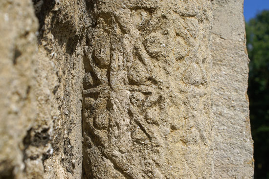 The right hand shaft of the south door, showing (left) the outer face decoration and (right) the slightly more sheltered and therefore less weathered inner face.