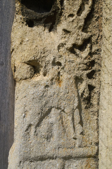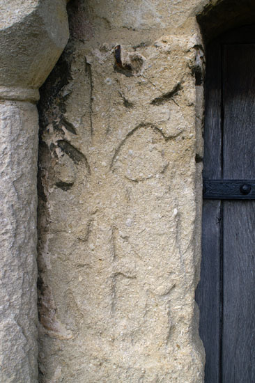 Left: On the left door jamb, this is a carving of two figures - it may be Adam and Eve - under a tree.Centre: On the left inside of the doorway now, this is the clearest of the carvings. It has been “cut off” on the right but is clearly two men wielding sticks. The British History website reports speculation that this may be a hunting scene inspired by St Tibba, who is believed to spent most of her c7 life at nearby Ryhall. If so, this may reinforce the suspicion that much of what we see here is Anglo-Saxon. Right: Despite my best efforts and using all manner of trickery in Photoshop, I still can’t make out what this carving is that underneath the one illustrated left
