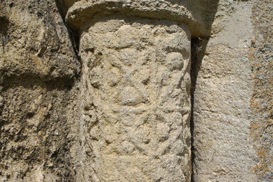 The right hand shaft of the south door, showing (left) the outer face decoration and (right) the slightly more sheltered and therefore less weathered inner face.