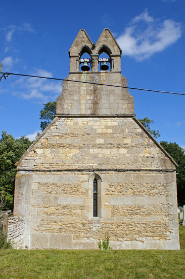 Left: The plain but ancient lintelled north door with a crude pattern inscribed. This, again, is these days attributed to the Norman period. It is worth noting, however, that lintelled doors were more common in the late Anglo-Saxon period. Would such crude decoration have been carved by the Norman builders? Centre: The rebuilt west wall. Right: Bell-cotes tend to be rather plain - the poor relations of bell towers. Essendine’s, however, is more classy. It is c13 with nice little shafted jambs to the arches, complete with moulded capitals and bases.