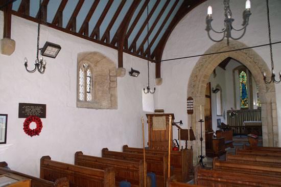 Left: The nave looking towards the chancel. Note the chancel arch that was originally round-headed Romanesque. The triple lancet east window is modern. Right: Looking towards the west wall. It was rebuilt in c19 so the lancet window and its deep splay are not really “authentic”. Behind the curtain to the right is the north door.