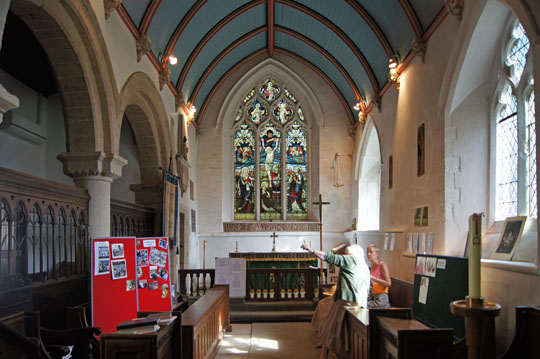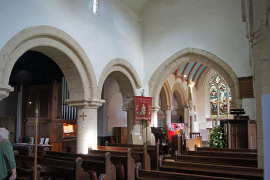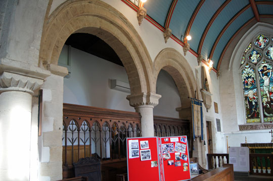 Left: The chancel with its Norman north aisle and its Victorian east window. Note the narrowness of the aisle at this end of the church. Right: The view to the west end. Note the strong contrast between the Norman north arcade and the southern one of 1300. An aesthetic disaster!