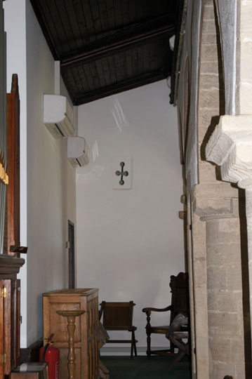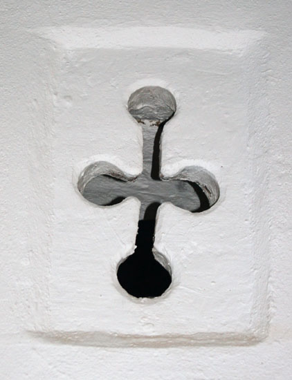 Left: The west end of the north aisle. This was probably an external wall in the original Norman building Centre: The remarkable (and original) cross-shaped window. Right: Filled in Norman window space on the south side of the chancel.