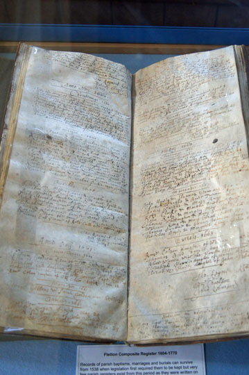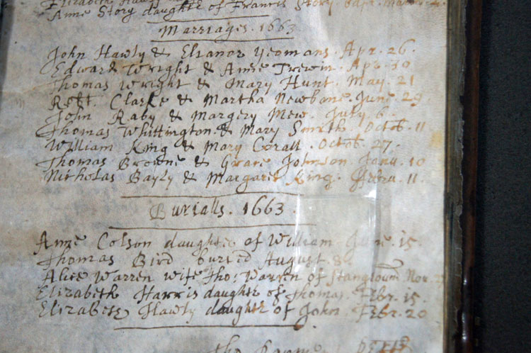 When we visited it was an open day and the church had produced its parish records (right) . Above we can see in close up the marriages and burials of 1663. Charles II was king and this was the year that Robert Hook proposed that living organisms were composed of cells.