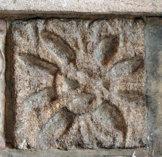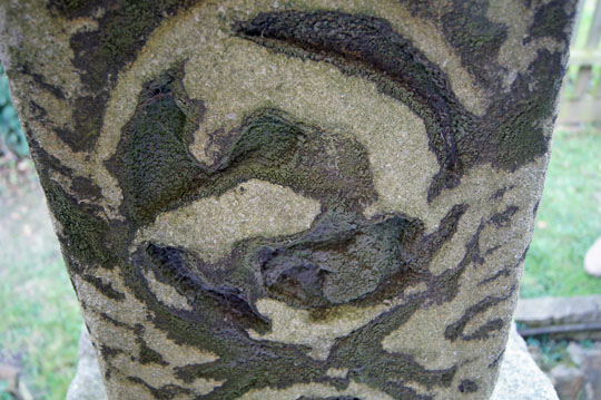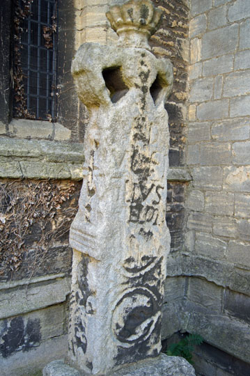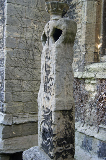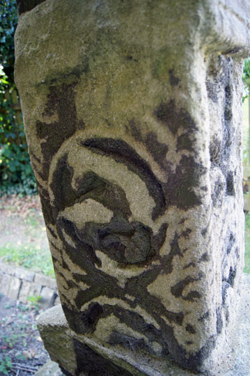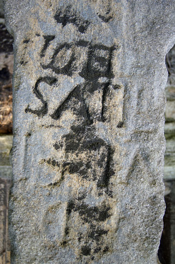 Left: There is an almost graffiti-like inscription on the upper west face. Centre: The east face is difficult to photograph, being so close to the church wall, but thus is clearly a beast of some description. Right: The south face is the most weathered and it is difficult to discern anything,