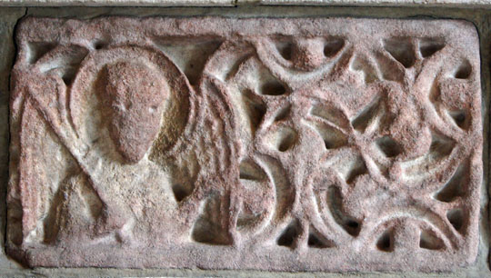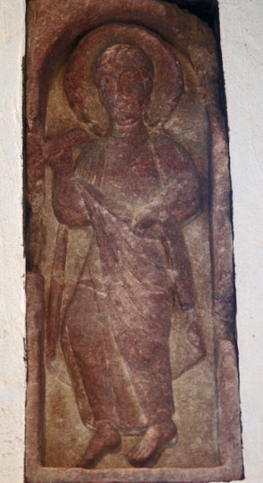 Left: The Anglo-Saxon frieze carvings in their new position behind the altar. Nobody knows what proportion of the original frieze these fragments constitute nor whether they should be mounted in this sequence. Centre: The figure of St Michael in the south chancel wall. Right: The unidentified second figure of an evangelist. Note the pink hue on these carvings that matches that of those in the frieze.