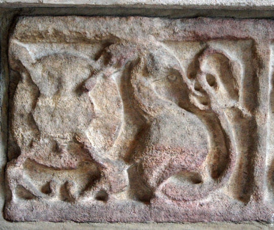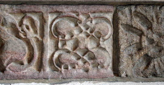 Left: The rather extraordinary Anglo-Saxon churchyard cross at the west end. The top would have been a circle enclosing a cross but the top section has been lost and someone has placed a rather bizarre top stone. I think it looks like something one might buy from a garden centre! Centre: The lower section of the north face. This looks lihe a pair of birds placed back to back - a common device in church iconography. Right: The lower section of the west face has what may be an image of a wild boar.