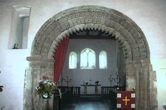 **Left:**The Norman chancel arch with zig-zag moulding. To the left is the top of the stairway to the long-disappeared rood screen. Right: The nave seen from the top of the rood-screen steps.