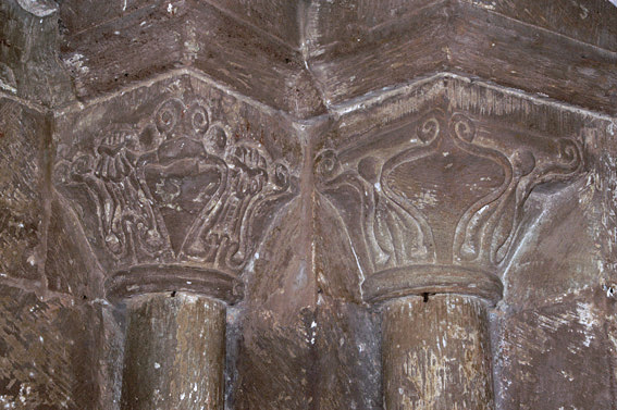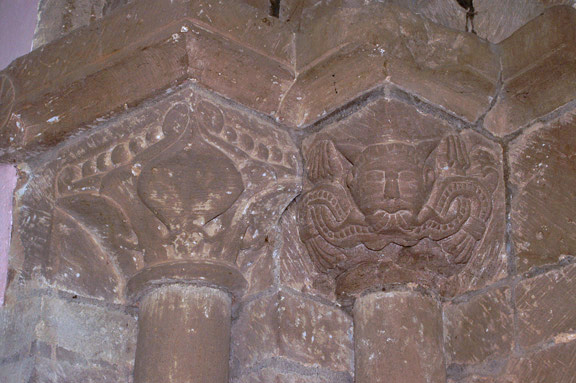 Left: Chancel arch capitals, north side. These show “water leaves”, an eastern motif that surely owes itself to the Templars’ Crusader origins. Right: Capitals on the south side of the chancel arch. Some say the splendid right hand one is a form of “green man”. If it looks to you more like a green cat then you are right. This particular variation of the green man theme - if that is what it is - is usually known as a “cat mask” and is very commonplace particularly on chancel arch capitals. Nobody seems really to now why its origins.
