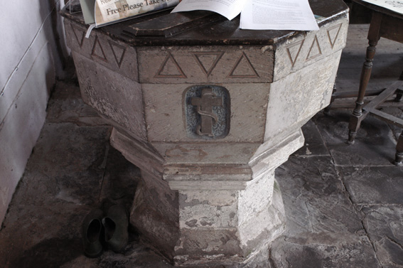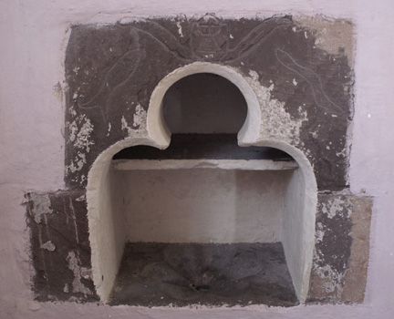 Left: The tower from the west end. As befits a defensive structure, there are a mere three window openings. Note its massive proportions compared with the church itself. Nobody could mistake this for an everyday bell tower. Right: A holy water stoup cut into the wall neat the west door.