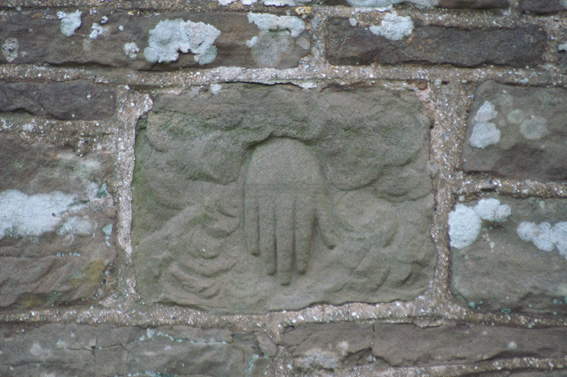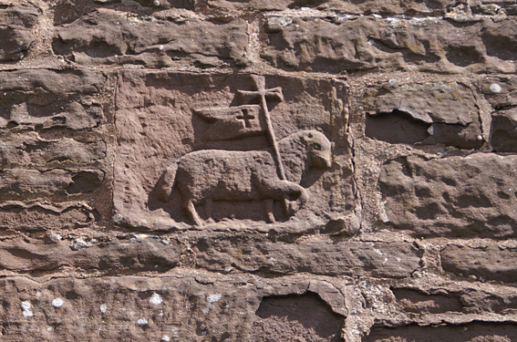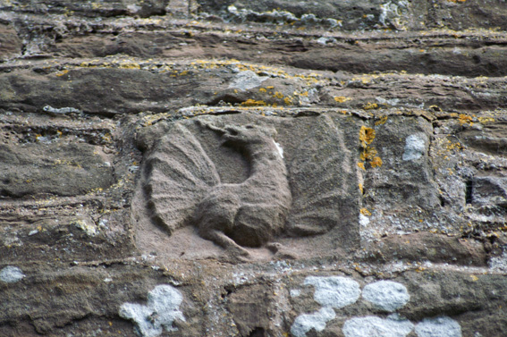 Left: Dextra Dei (“Hand of God”) on the north wall of the nave. Second Left: A winged fragon (or griffon) above the west door. This almost certainly is a Templar motif from the East where dragon images had benevolent connotations. Second Right: “Agnus Dei” (Lamb of God) above the west window of the south chapel. Far Right: “Swastika” on the south wall of the chapel. See footnote.