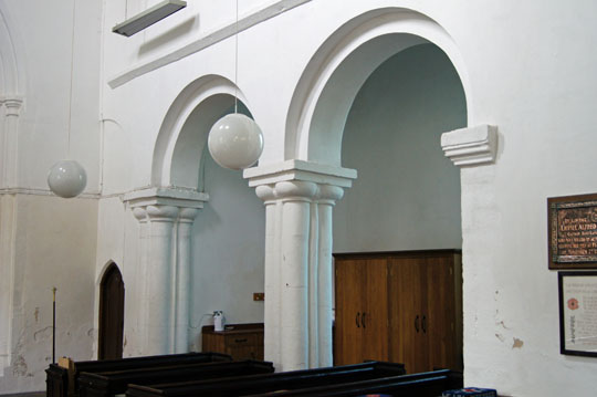 Left: The lofty arch that led to the long-disappeared north transept of the original church. This would, of course, have been one of four arches at the church’s “crossing”, probably supporting a central tower. Centre: And talking of “bodgers”…this is what was contrived to replace the south-western bay of the arcade, presumably when the western tower was added. The western respond of the original arch was shifted inwards and with almost comical ineptitude a totally lopsided pointed “arch” was made using the eastern part of the oirginal Anglo-Saxon arch. Right: The eastern face of the north transept arch has the same pattern of clustered piers supporting simple bulbous capitals as is seen in the aisle arcades.