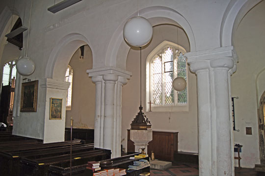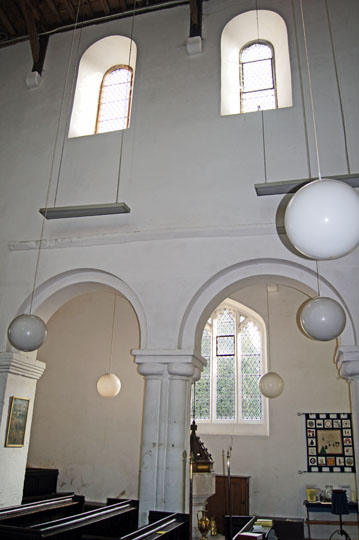 There are two remaining Anglo-Saxon aisle bays to north (left) and south (right). Originally there were third bays to the west. In cross section the pillars are quatrefoil in shape. Each of the four piers terminates in a rounded capital, the four supporting a two-stage square abacus. In between each pair of the four larger shafts is a much thinner one The capitals on the north side are slightly less bulbous than those on the north. It is interesting to note the geometric perfection of the curves of each arch as well as of the pillars. Compare this with some of the rather lopsided - even bodged - work that can be seen in some Norman churches, for example. All the signs at Great Paxton are that the Anglo-Saxon work was carried out by the best masons available.