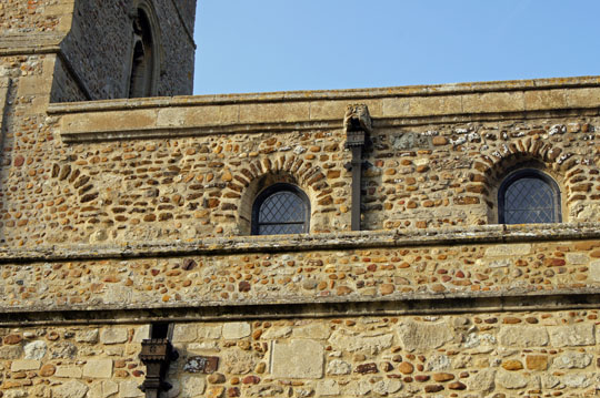 Left: It is interesting to look at the clerestory from the outside. The sheer geometrical regularity of the windows on the inside has you wondering whether they were sympathetic later additions, but the exterior view leaves you in no doubt. Note the use of small stones to make the arches. On the western end there is half of a blocked window giving the only external evidence that part of this end of the church was lost to accommodate the tower. Right: The church from its “traditional” south eastern view, with the usual collection of unremarkable gothic windows, offers remarkably little evidence of the church’s origins.
