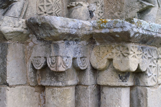 The capitals on the north doorway are again much more decorated than on the south. There is a mass of quite delicate patterns visible here. To the left and right can be seen stone panels of chip carving that are part of the walls rather than of the capitals. This picture shows the remarkable state of preservation of much of this church.
