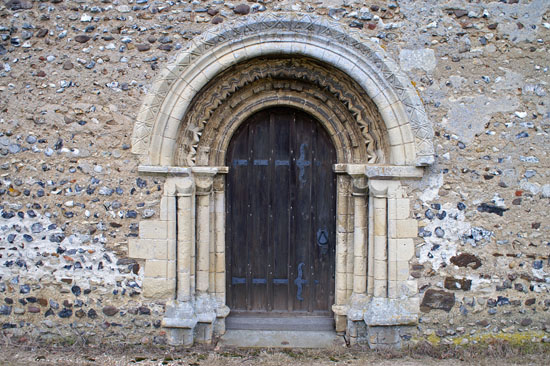 Two Norman doorways. Left: The beautiful north door. See larger pictures below. Right: The south doorway.