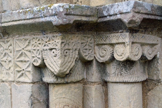 The capitals on the north doorway are again much more decorated than on the south. There is a mass of quite delicate patterns visible here. To the left and right can be seen stone panels of chip carving that are part of the walls rather than of the capitals. This picture shows the remarkable state of preservation of much of this church.