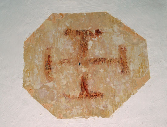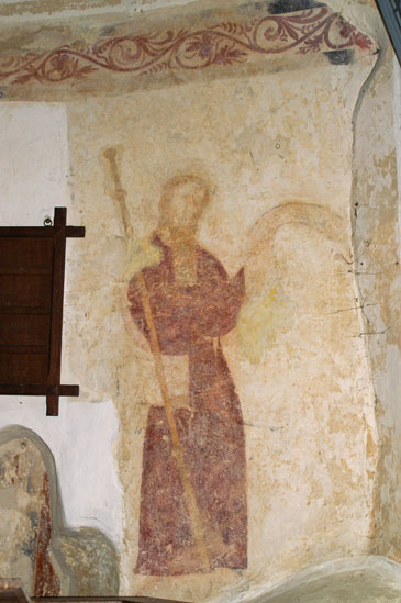 There is a number of fragments of mediaeval wall painting. A fourteenth century St Christopher was in his traditional place opposite the south door where travellers could look in and see him and ask for protection. In the spandrels of the chancel arch are trumpet-blowing angels. Perhaps the best painting is behind the pulpit It is a saint carrying a scroll and believed to be St James the Great. There are also painted consecration crosses.