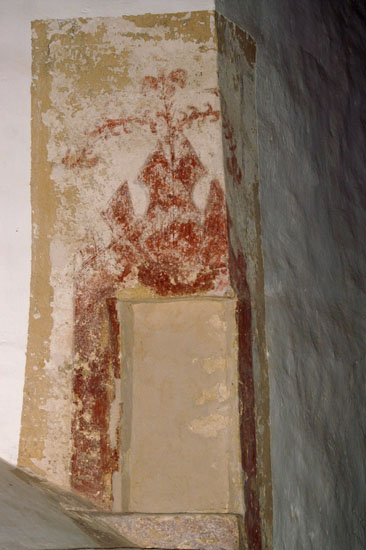 Left: St James the Great. Note the beautiful abstract leaf design above his head. Centre: Wall painting in a window recess on the north side of the nave. Right: A rather less well-preserved St Christopher.