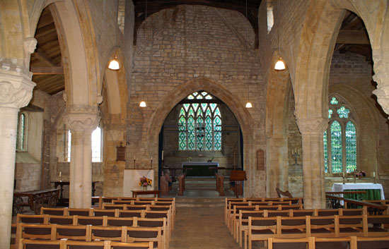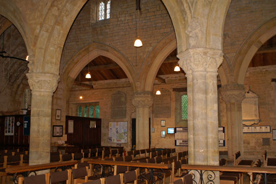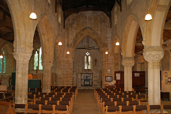 The view to the west end. The arcades have three bays each, resulting in four sets of “linked arm” capitals.