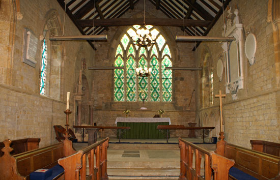 The chancel. The east window with its flowing tracery is of the late Decorated period.