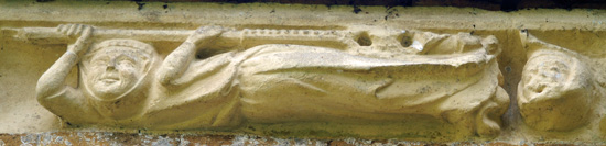The “linked arm” capitals. The top two pictures are the north aisle; the lower two pictures are the south. The carvings on all the North Oxfordshire churches are a treasure house of information on the dress styles of the day. Note that the abaci surmounting the capitals have identical mouldings and the geometry of north and south arcades also appears roughly identical. Yet the north aisle has castellations. Strangely, they rather look as if they were added as an afterthought. If so, one can only wonder why this was only done on one arcade! Note that on all the linked arm capitals in the North Oxfordshire group churches are single sex - indeed they are never mixed on one side of the aisle, never mind on a single capital. This leads to speculation that the congregation (and let us remember that seating would have been available only for the infirm at this time) were similarly segregated.